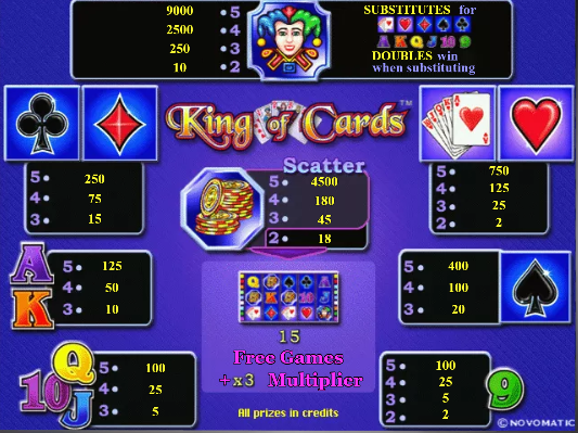 Conviértete en el rey del casino con King of Cards, una tragamonedas de Bar de Novomatic creada con 5 carretes y 9 líneas de pago.